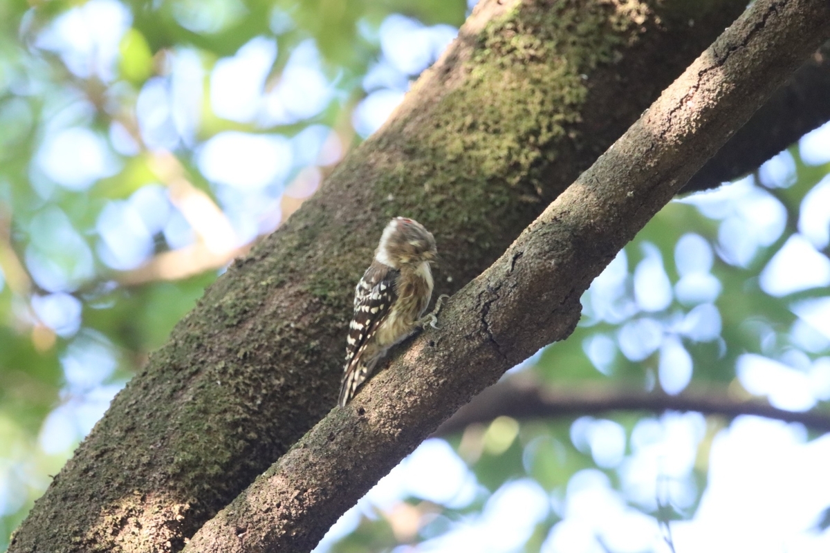 いつもなら声や木をつつく音でコゲラの存在を検知できるのですが、セミの声がうるさいせいで、この時期なかなか見つけれなかったりします。