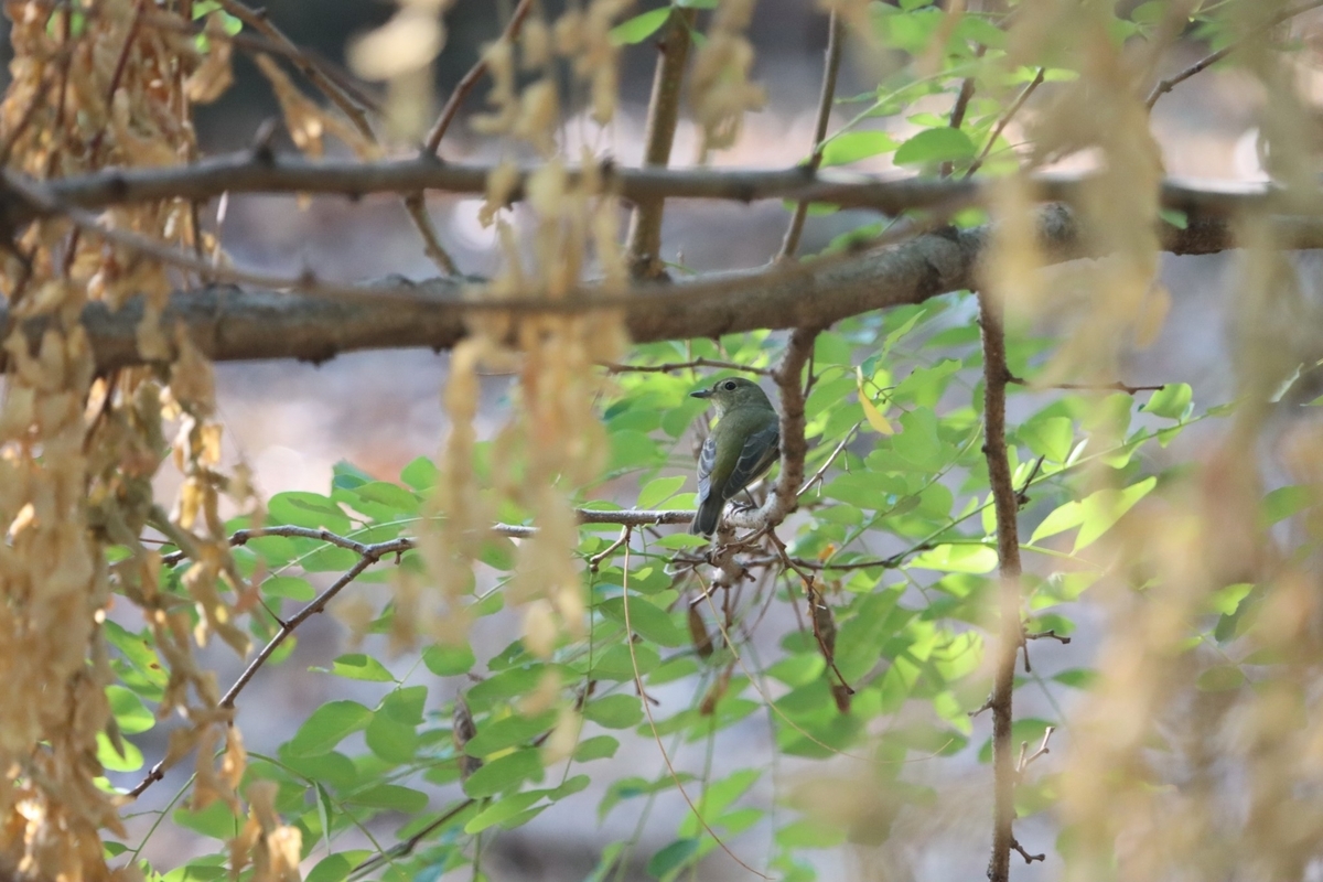 木々が邪魔をして、綺麗には撮れませんでしたが、この後ろ姿はキビタキのメスで間違いないと思われます。
